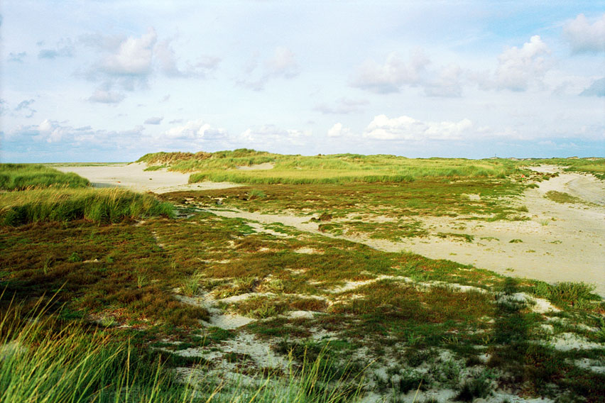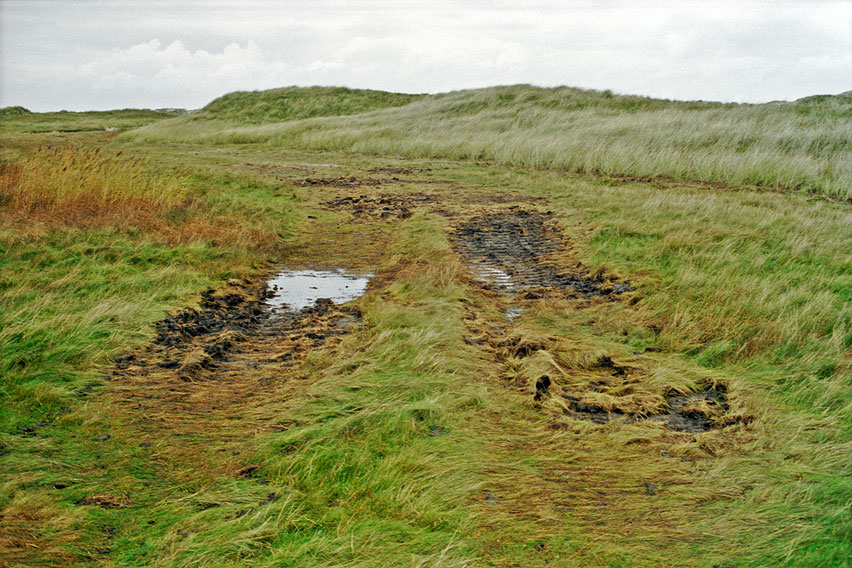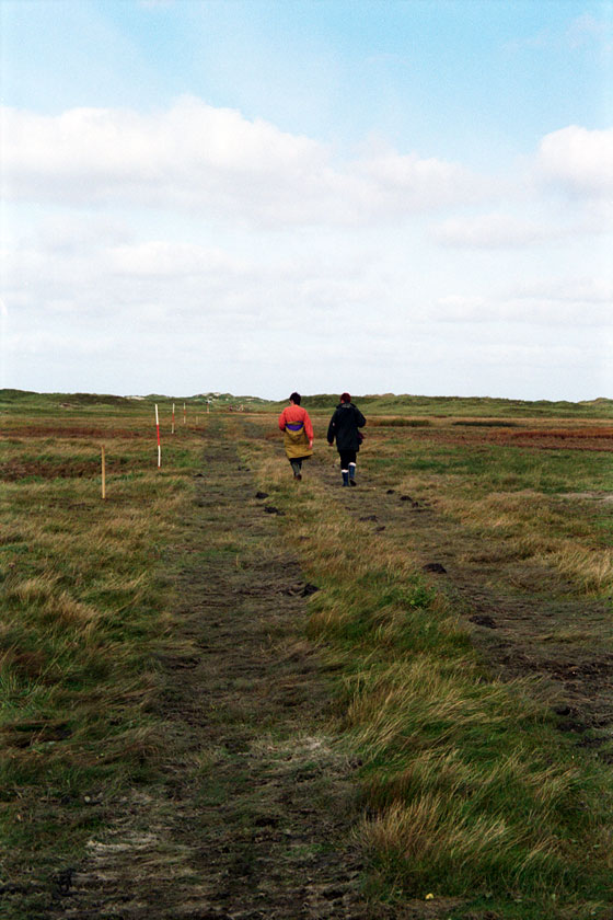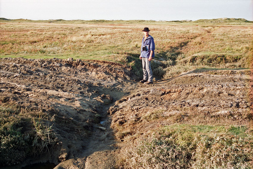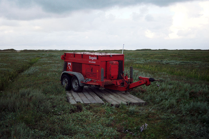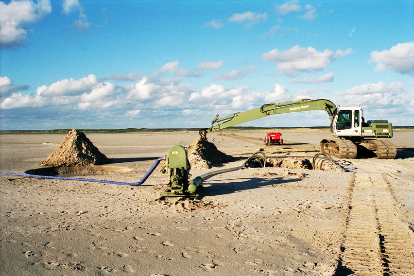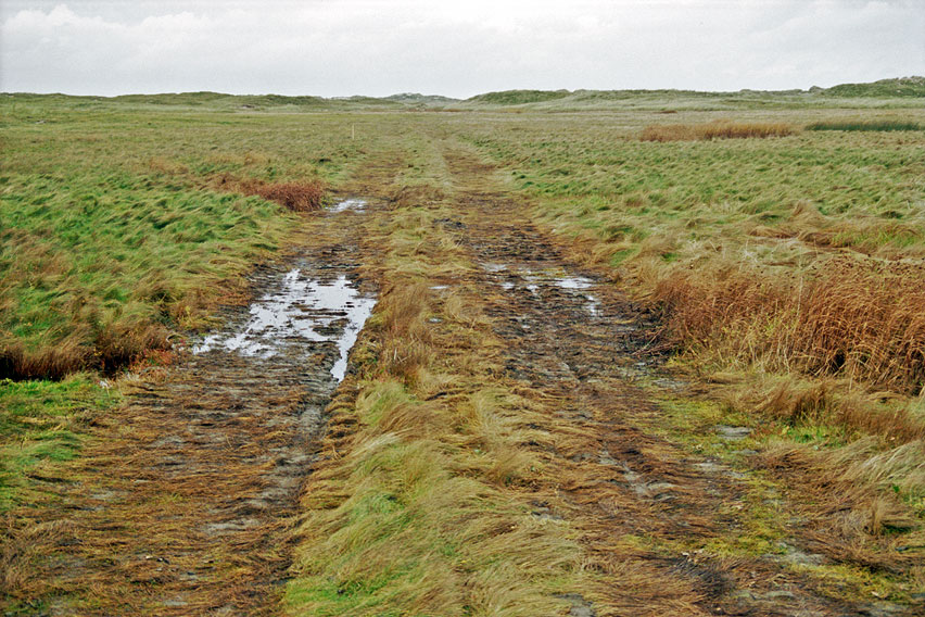 Natürlich wurden die Gerätschaften dann auch von der Ziehgrube auf dem Mittelweg zur letzten Baustelle auf dem Strand wieder auf direktem Wege befördert, statt wie angekündigt über Mittel- und Versorgungsweg. Das ist an dieser Stelle besonders problematisch, da hierdurch der vorhandene Dünendurchbruch – der von Touris sowieso gerne als "Weg zum Strand" interpretiert wird, tatsächlich damals aber direkt in die besonders empfindlichen Embryonaldünen im Schloppbereich führte – jetzt wirklich Weg-Charakter bekam. Bei uns hieß er dann fortan nur noch "Telekom-Durchbruch" (wobei die in dieser Art in diesem Bereich einzigartige Lücke in der Weißdünenkette durchaus bei der ursprünglichen Verlegung der Leerrohre entstanden sein könnte) | ![]() |