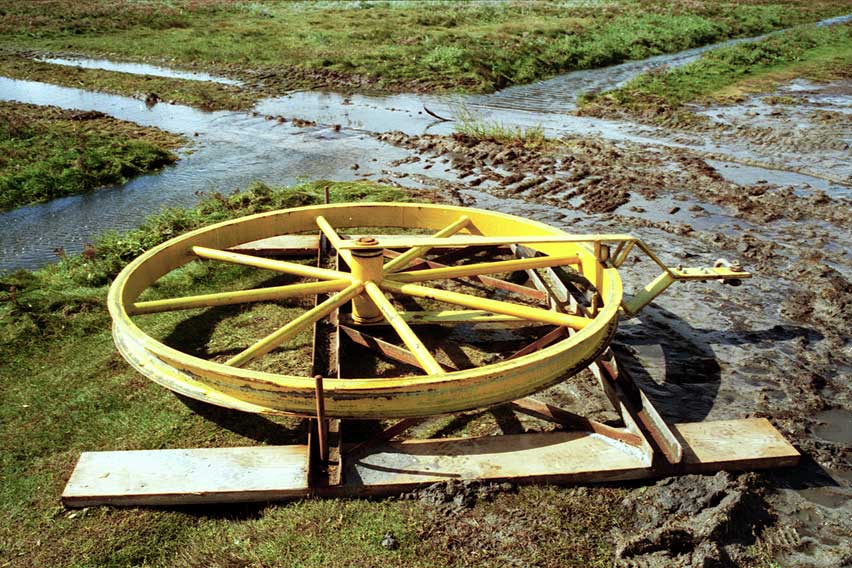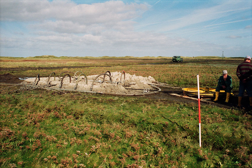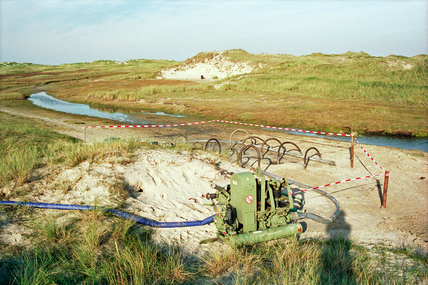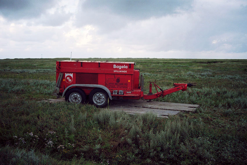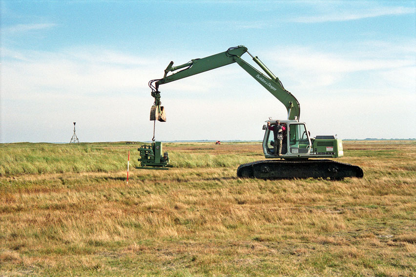 Das erste Zeichen, das etwas nicht so läuft wie angekündigt, war dann ein roter Fleck in der Salzwiese: Warum steht da plötzlich eine Spillwinde mitten im Heller, etwa auf halbem Wege zwischen Hellerkante und Südweg (wo eigentlich die erste Ziehgrube hätte sein sollen)? | ![]() |