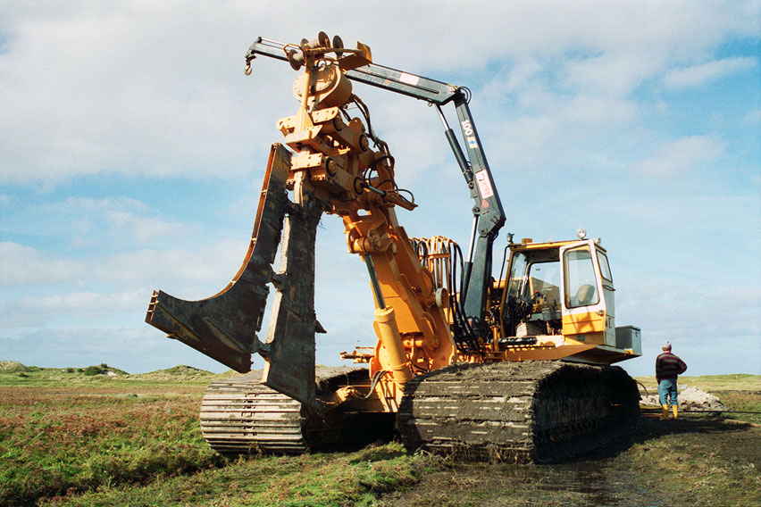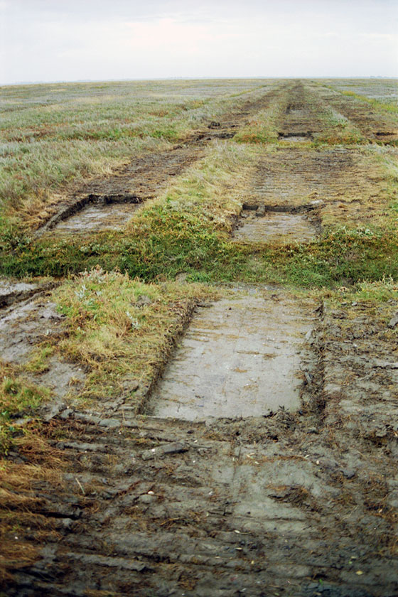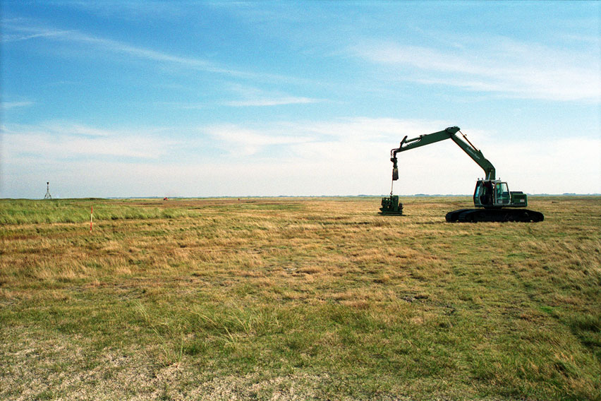![]() Wie sich herausstellte, ließen sich die Kabel im Bereich des Hellers nicht in die Rohre einziehen – gerüchteweise hieß es, die Rohre seien zu stark gebogen (unter den Grüppen hindurch) und der Widerstand des Kabels beim Ziehen damit zu hoch. Also entschloß man sich, den Pflug – der im Watt angeblich hervorragend funktioniert haben soll – auch im Heller einzusetzen, um die Kabel bis zum Südweg direkt im Heller zu vergraben, ohne Nutzung der Rohre. Das war aber wohl keine sooo gute Idee, wie sich herausstellte, da die Pflanzendecke dem Schwert des Pfluges zuviel Widerstand entgegensetzte. Folge: Der Pflug fuhr sich mehrfach fest, die Gleisketten drehten durch, und hobelten die Planzendecke flächig ab... Uns wurde erzählt, man habe dann zeitweise bis zu zwei Bagger vorgespannt, mit entsprechend fatalen Konsequenzen für den Zustand des Hellers... das fand aber ohne unser Beisein statt, wir haben nur gesehen, das von der Pflanzendecke stellenweise nix mehr übrig war. |