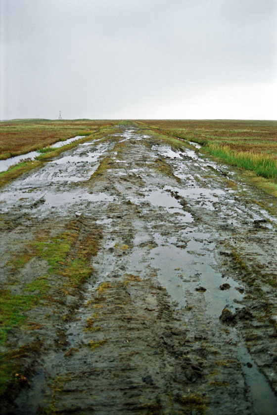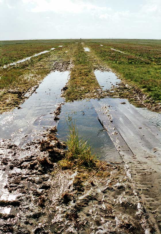 Bei etwas weniger Touri-freundlich trockenem Wetter verwandelt sich das ganze dann schnell in eine Schlammwüste – mit der Folge, daß die Leute sich stattdessen Trampelpfade nördlich des offiziellen Weges suchten, mitten durch die Kernzone. Und da soll man ihnen dann klar machen, daß sie das nicht dürfen, während gleichzeitig die Bagger darin rumfahren. Manchmal wäre es einfacher gewesen zu sagen "Baustelle – Lebensgefahr – Betreten verboten" statt "Nationalpark Kernzone, bitte bleiben sie auf den, äh, Wegen"... | ![]() |