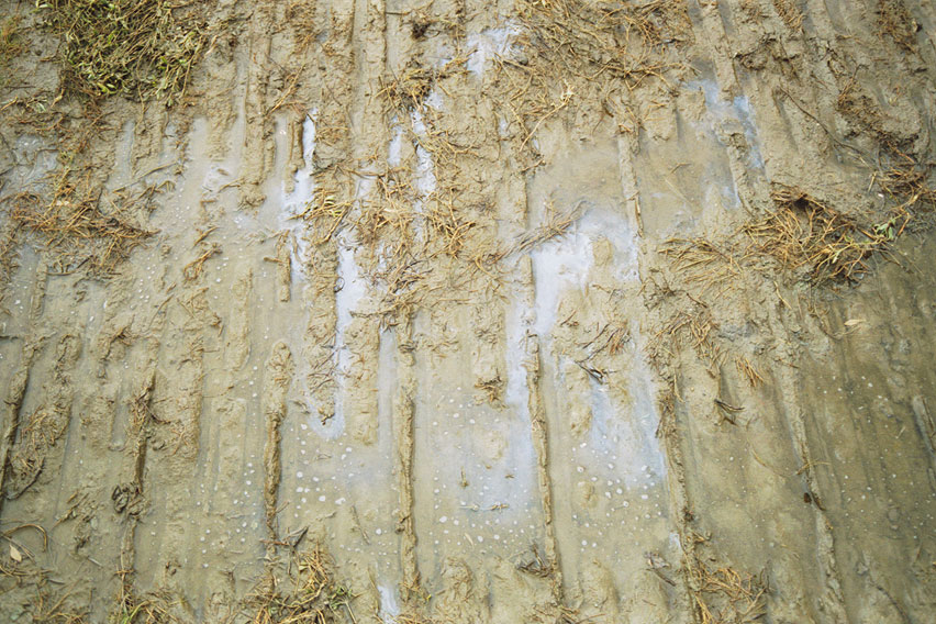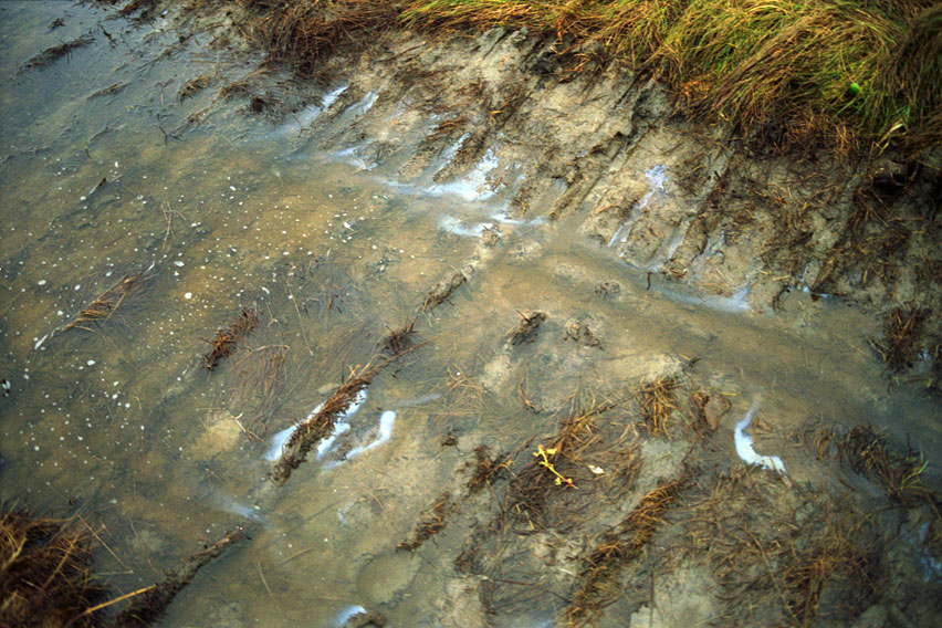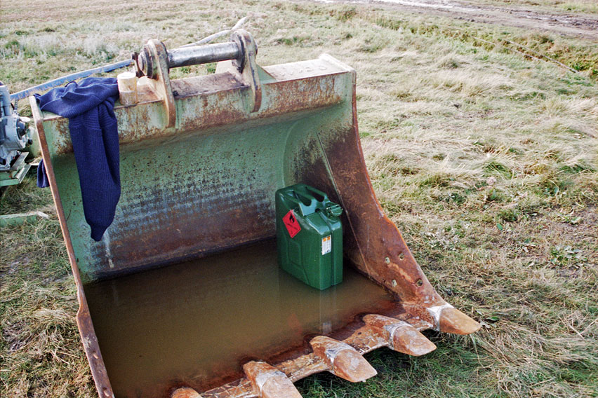 Dummerweise gab es da ein Problem mit den Pumpen, die die Ziehgrube trocken halten sollten: Sie verloren Treibstoff, in nicht ganz unerheblichen Mengen. Der Bauleiter vor Ort – der übrigens erzählte er sei eigentlich Student, dies sei nur ein Ferienjob für ihn – meinte dazu lapidar, vieles von dem Gerät auf der Baustelle hätte wohl eigentlich Schrottwert. Es passierte also was bei dem Hochwasser passieren mußte: Der Heller stand flächig unter Öl... Ich habe leider nur Aufnahmen von den Resten danach (die sich noch dazu als schwierig zu fotografieren erwiesen): |
