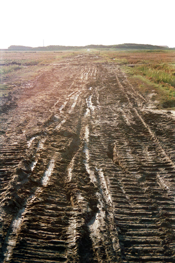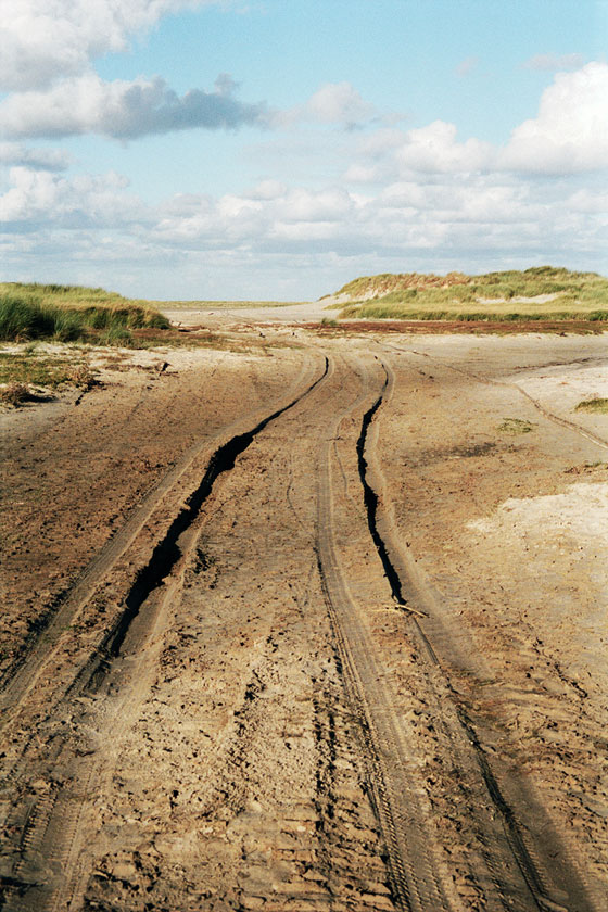 Es sind auch deutliche Fahrspuren zu erkennen, die – Überraschung! – zur Wattkante führen... war wohl nix mit Transport des Materials über Hafen Norderney. | ![]() |