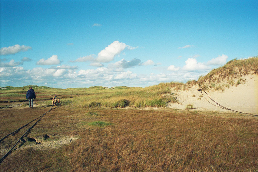 Ausgelegte Kabel vor dem Wiedereinziehen Richtung Strand (quer durch die Gegend, offenbar wo gerade Platz war, auch direkt über die Düne o.ä.) | ![]() |